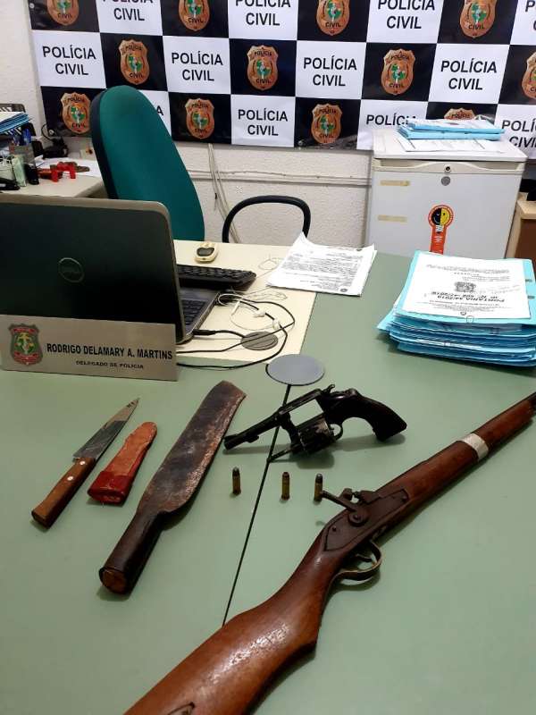Na residência do suspeito, os agentes encontraram um revólver calibre 38 municiado, uma espingarda, uma faca e uma foice. Diante dos fatos, todo o armamento foi apreendido e Aparecido Moreira foi autuado em flagrante por posse irregular de armas de fogo. Ele foi conduzido para uma unidade policial onde ficará à disposição da Justiça.