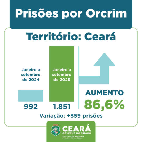 O trabalho ininterrupto das Forças de Segurança do Estado ocasionou a prisão ou apreensão de 1.851 pessoas, em flagrante ou por mandado, por integrar organizações criminosas, entre janeiro e setembro deste ano no Ceará. O número representa um aumento de 86,6% em comparação com o mesmo período do ano passado, quando houve 992 capturas. No que diz respeito às capturas por homicídio, foram presas ou apreendidas 2.148 pessoas, um aumento de 33,4% em relação ao mesmo período de 2024, quando foram contabilizadas 1.610 prisões.