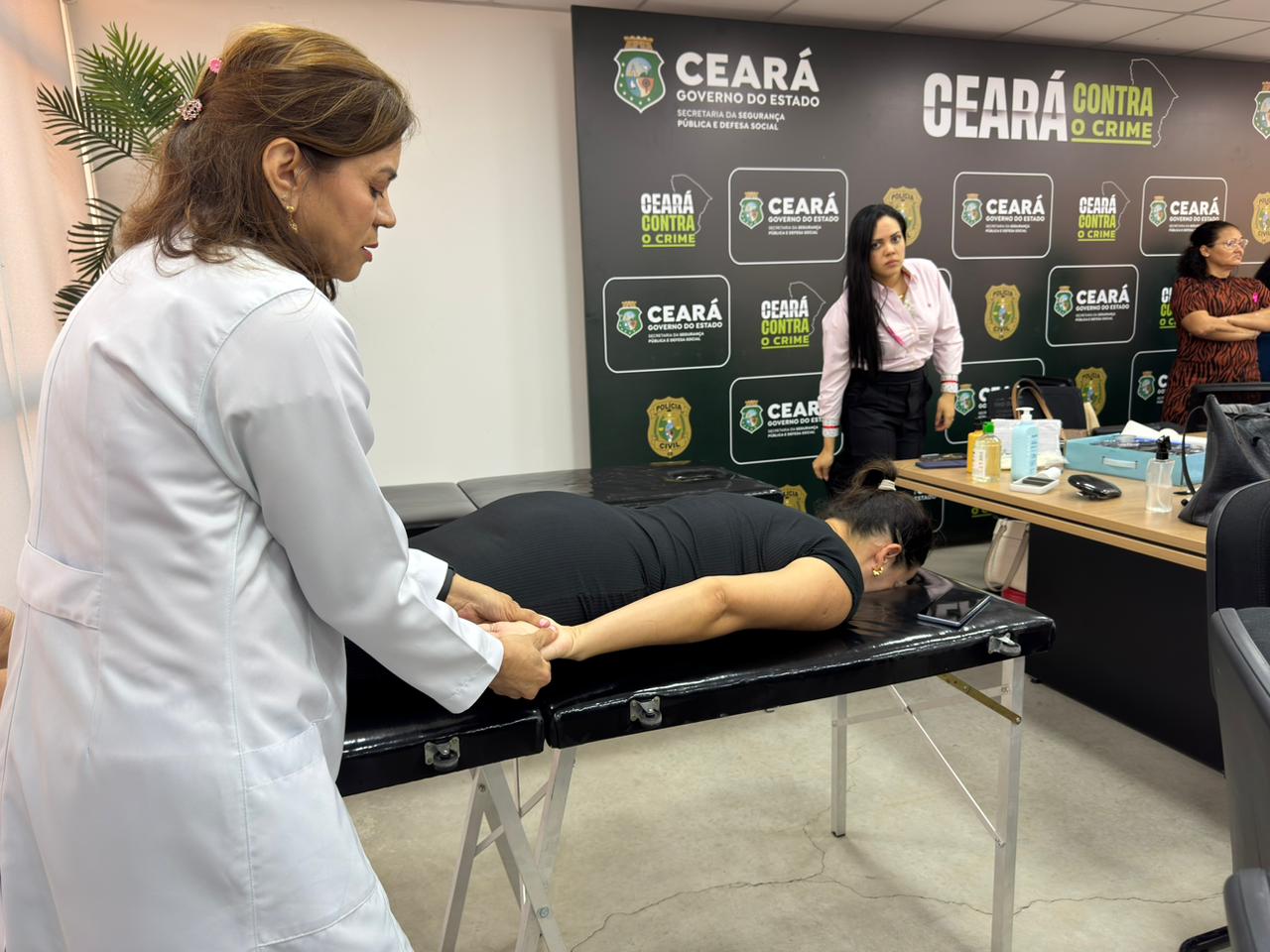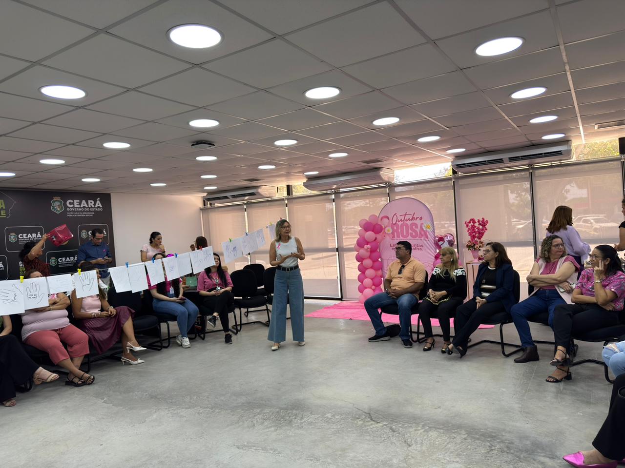 Na manhã desta quinta-feira (23), a Polícia Civil do Estado do Ceará (PCCE) realizou uma manhã de cuidados e serviços voltados às funcionárias da sede da delegacia-geral, em alusão à Campanha do Outubro Rosa. Entre as ações, foram realizadas palestras de conscientização sobre o câncer de mama e sessões de autocuidado, com liberação miofascial, ginástica laboral e consulta médica.