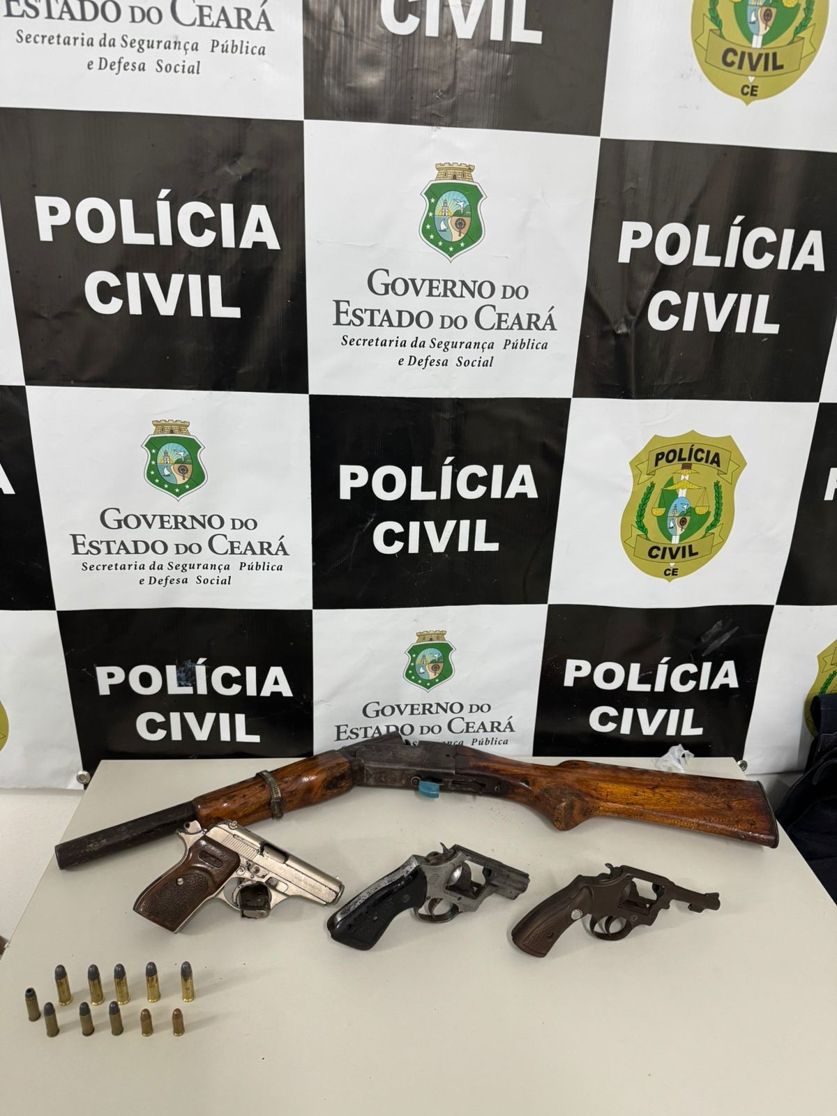 Ao tomarem conhecimento de que dois indivíduos estavam no bairro Pedrinhas em atitude suspeita, equipes da 1ª Delegacia de Polícia Civil de Juazeiro do Norte realizaram diligências até a localização dos suspeitos. Com a dupla, os policiais civis apreenderam dois revólveres calibre 38, uma espingarda, uma pistola calibre 9 milímetros, uma espingarda artesanal, oito munições calibre 32, cinco munições calibre 38 e quatro gramas de crack.