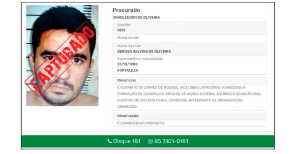 Com nove mandados de prisão em aberto por homicídios, integrar organização criminosa, Jangledson de Oliveira, de 37 anos, conhecido como “Nem da Gerusa”, já tinha dez passagens por homicídio doloso, além de ter antecedentes por roubo, integrar organização criminosa, associação criminosa e crimes de trânsito. O homem também é investigado por ter participado de diversos homicídios nas cidades de Itarema, Eusébio, Aquiraz e Maracanaú.