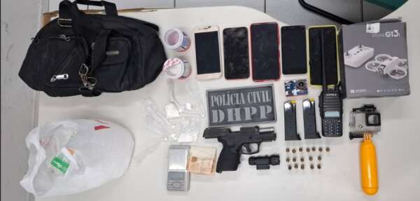 Durante as buscas na residência, os agentes apreenderam papelotes de cocaína já embalados para comercialização, uma pistola, munições de calibre 9 mm, carregadores de pistola, cinco aparelhos celulares, um rádio comunicador, uma balança de precisão, dinheiro em espécie e um drone. O material apreendido foi recolhido e o homem conduzido à sede da unidade especializada, onde foi autuado em flagrante pelos crimes de tráfico de drogas e posse ilegal de arma de fogo. As investigações seguem em andamento com o objetivo de identificar a possível participação do suspeito em outros crimes na região.