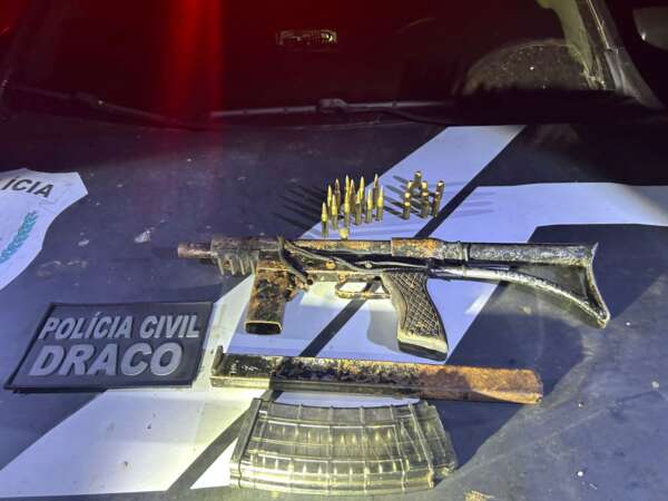 Em continuidade às diligências, já no período da noite de ontem (9), equipes da PCCE se deslocaram até a zona rural de Cariré, onde localizaram, escondidos em uma área de mata, uma submetralhadora artesanal, um carregador, 12 munições de calibre 5.56, 10 munições de calibre .40 e um carregador prolongado. Todo o material foi apreendido e encaminhado para os procedimentos cabíveis.