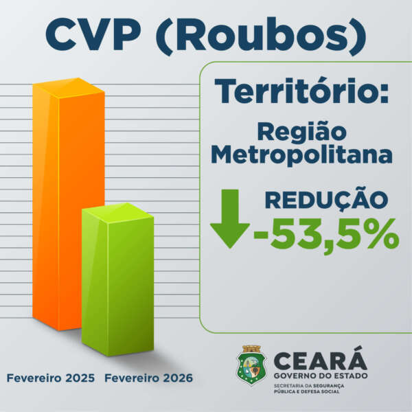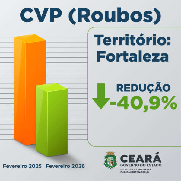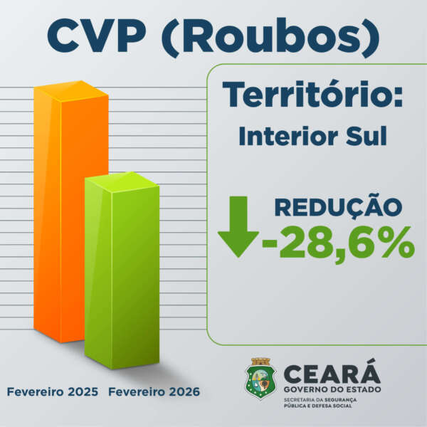 Em Fortaleza, a redução foi de 40,9%, com o registro de 867 roubos em fevereiro de 2026, enquanto no mesmo período do ano passado foram 1.468 casos, perfazendo um total de 601 registros a menos. Já no Interior Sul, a redução foi de 28,6%, com 75 ocorrências de roubo na área neste período, ante 105 ocorrências de CVPs no ano passado, com 30 casos a menos.