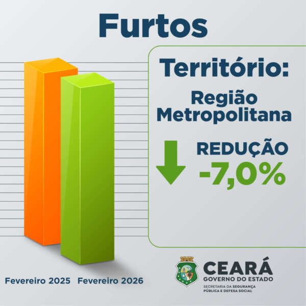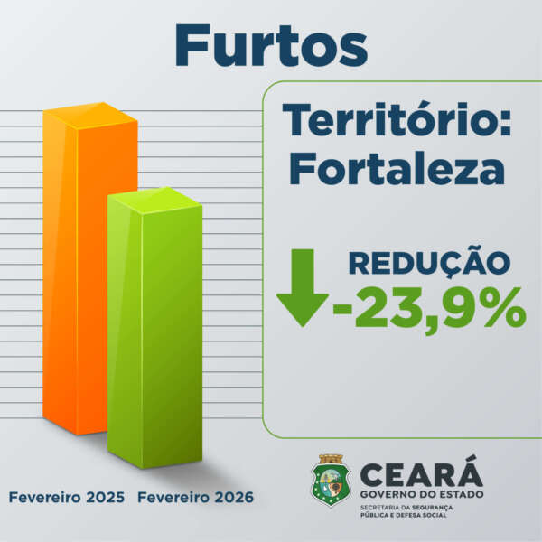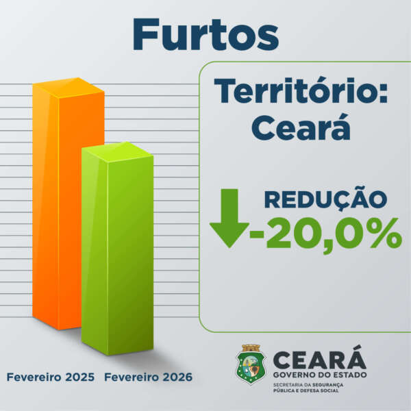 De acordo com o levantamento da Supesp, o balanço de furtos também apresentou redução no Ceará. Fevereiro de 2026 foi o melhor resultado dos últimos 49 meses,com registros de 3.697 procedimentos, contra 4.620 ocorrências no mesmo mês de 2025, tendo uma redução de 20%.